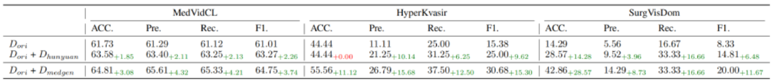 MedGen 和 HunyuanVideo 在三个医学视频监督下游任务中作为数据增强对任务效果提升的对比